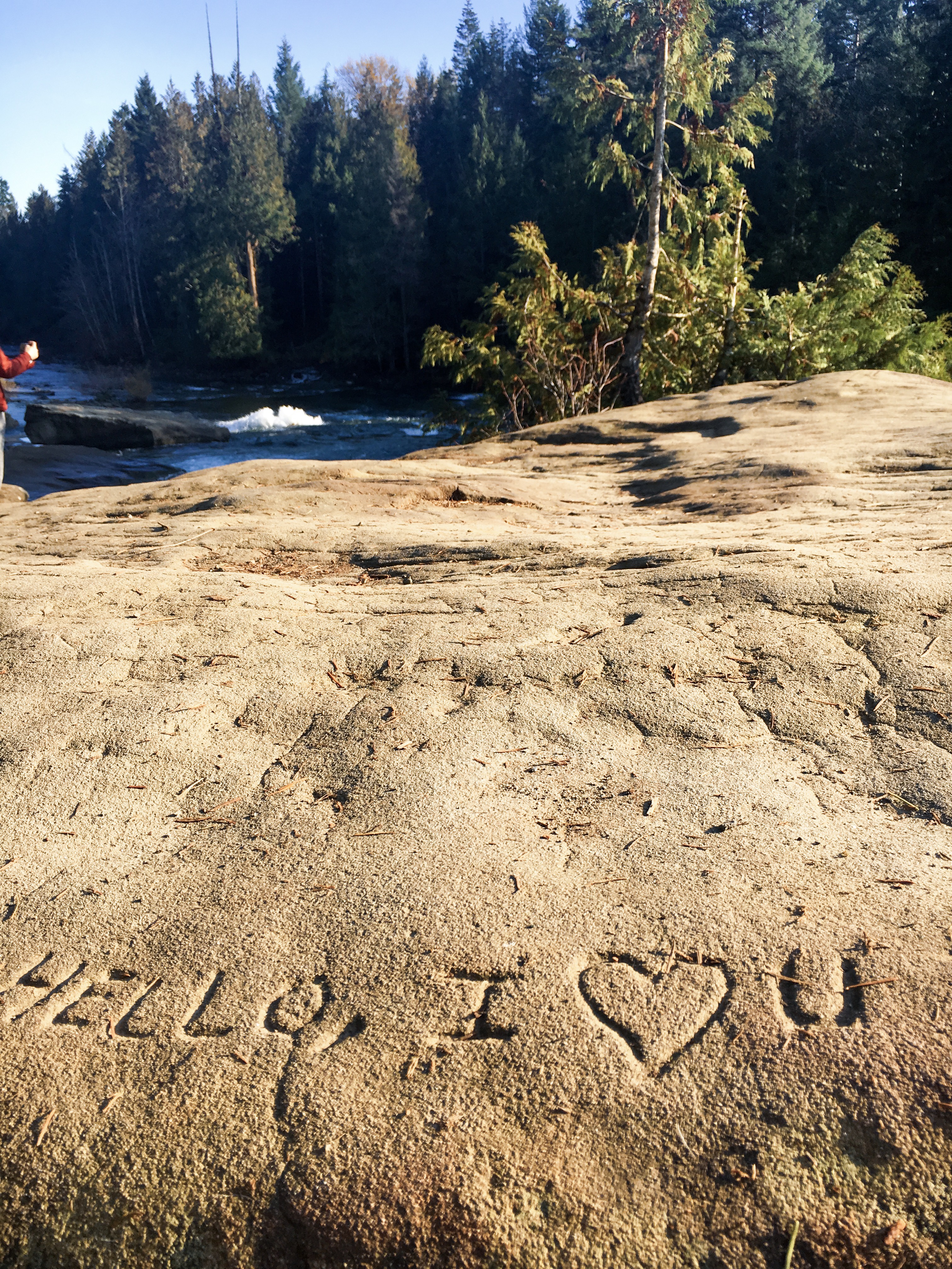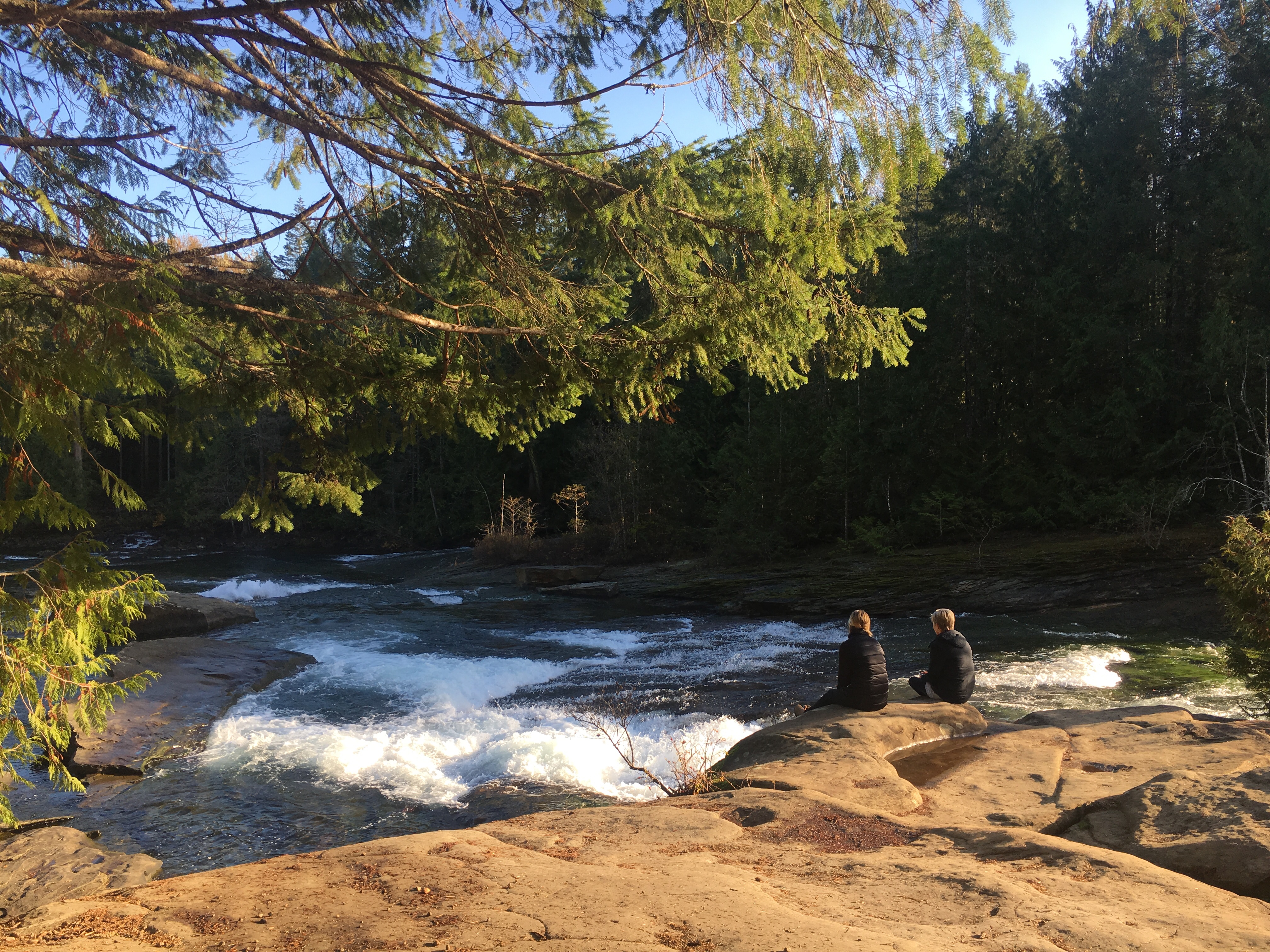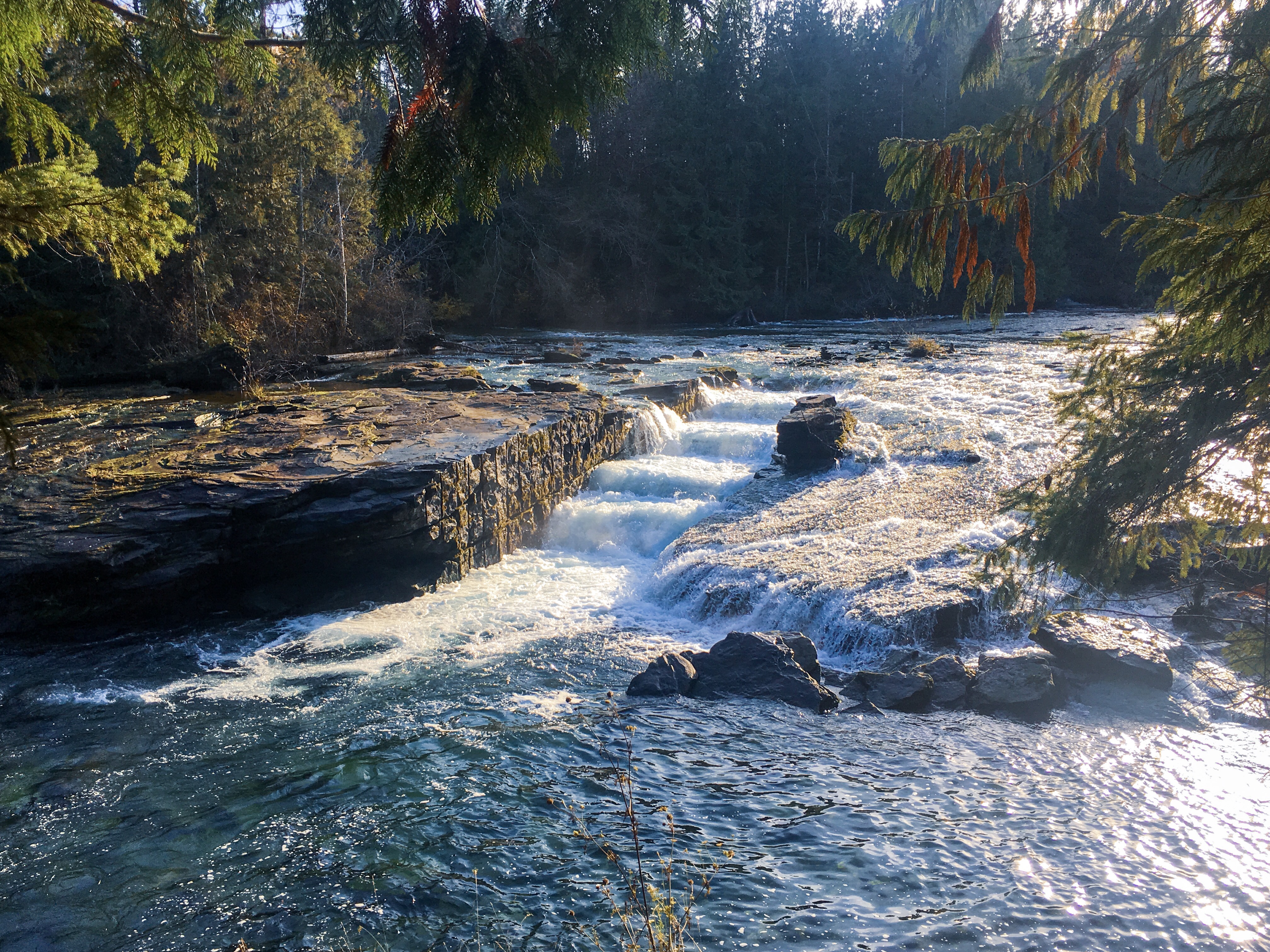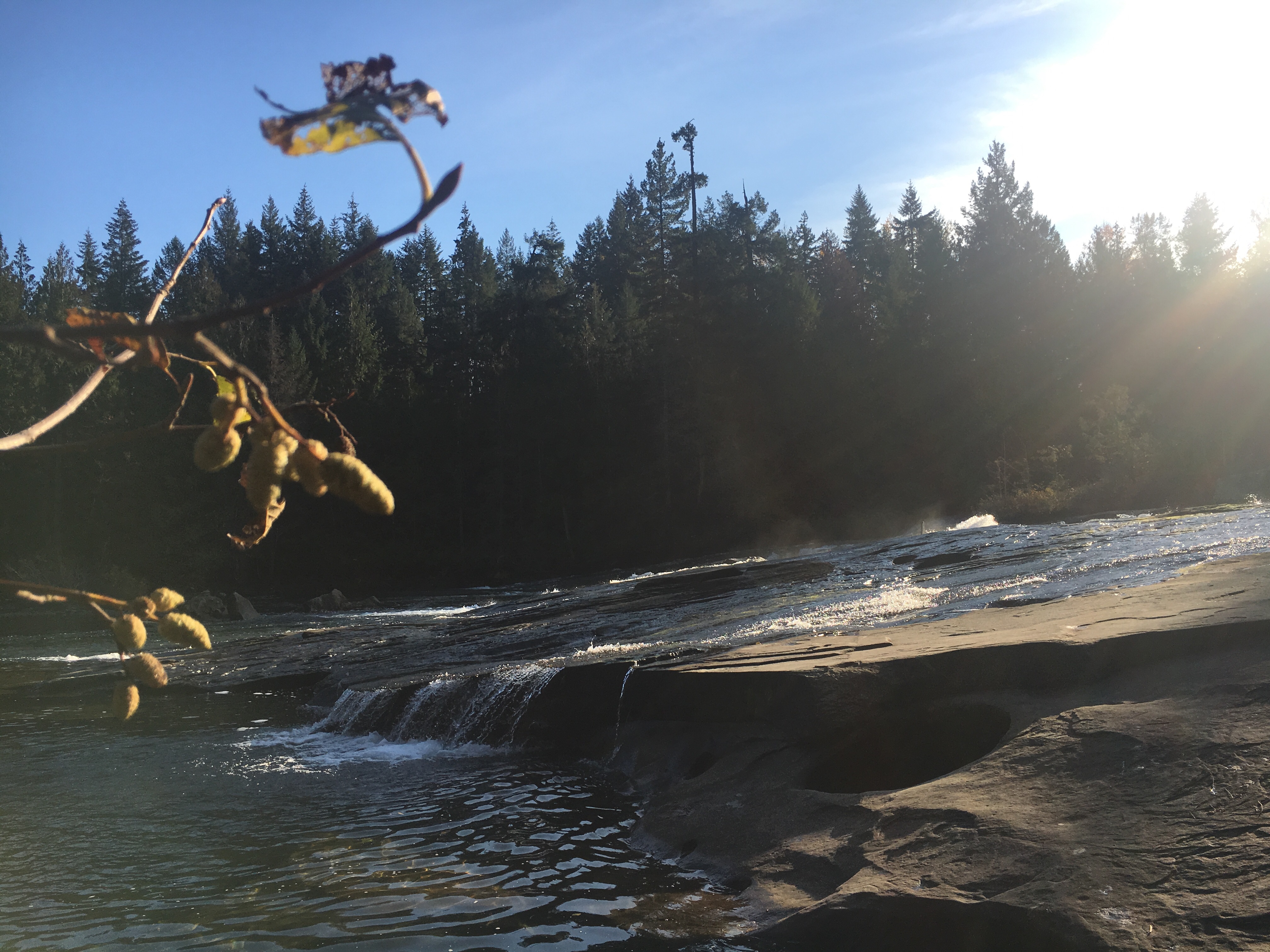 You’d see the sky is blue, that the Autumn sun is turning the still water green against the rocks while the churning water turns white hot. There’s two trees at the far end of my viewpoint glowing like embers among the evergreen pines, sticking out like the two new kids at school. There’s five other people here now, spectators on the edge of the rocks overlooking the waterfall obstacle in the 2018 Salmon Tough Mudder. If you were here you could feel the warmth of the sun on your back too, and the rocks acting like heated flooring on an otherwise freezing day.